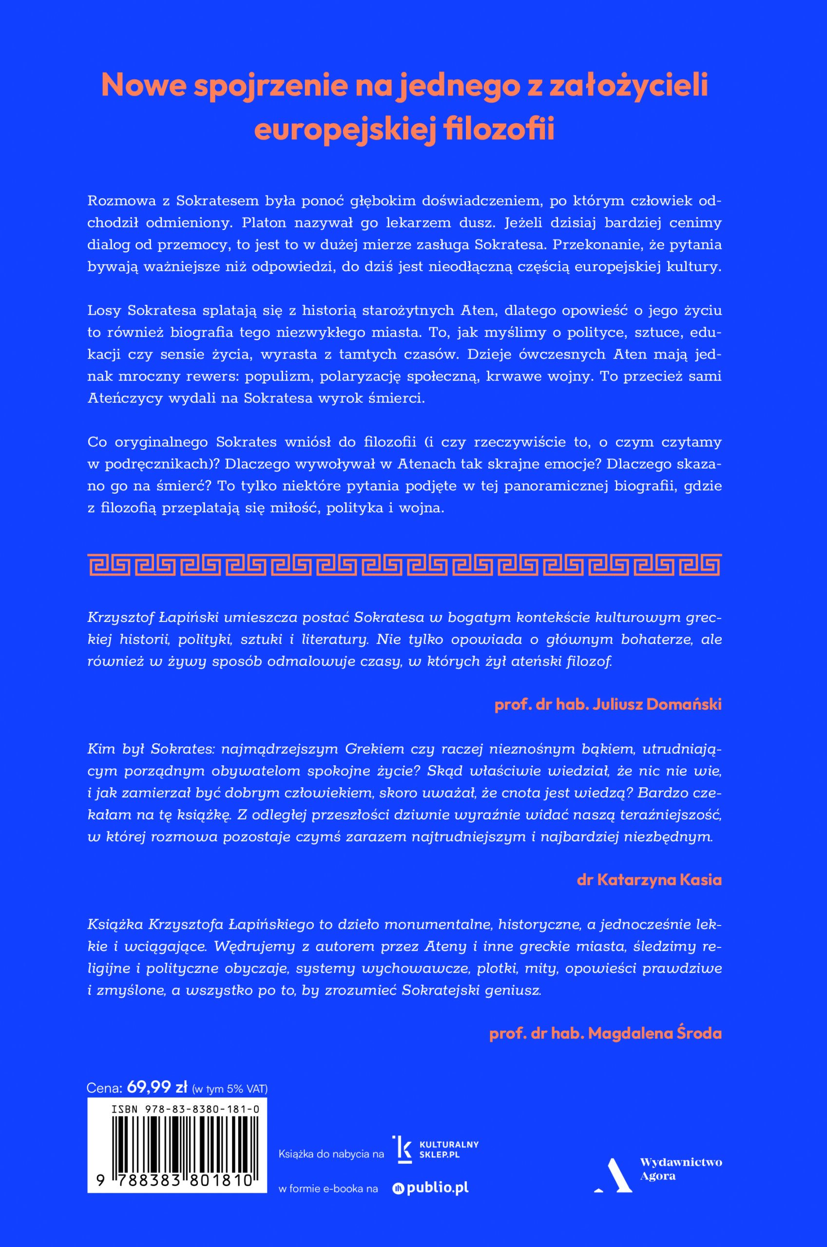 Książka Krzysztofa Łapińskiego to dzieło monumentalne, historyczne, a jednocześnie lekkie i wciągające. Wędrujemy z autorem przez Ateny i inne greckie miasta, śledzimy religijne i polityczne obyczaje, systemy wychowawcze, plotki, mity, opowieści prawdziwe i zmyślone, a wszystko po to, by zrozumieć Sokratejski geniusz.