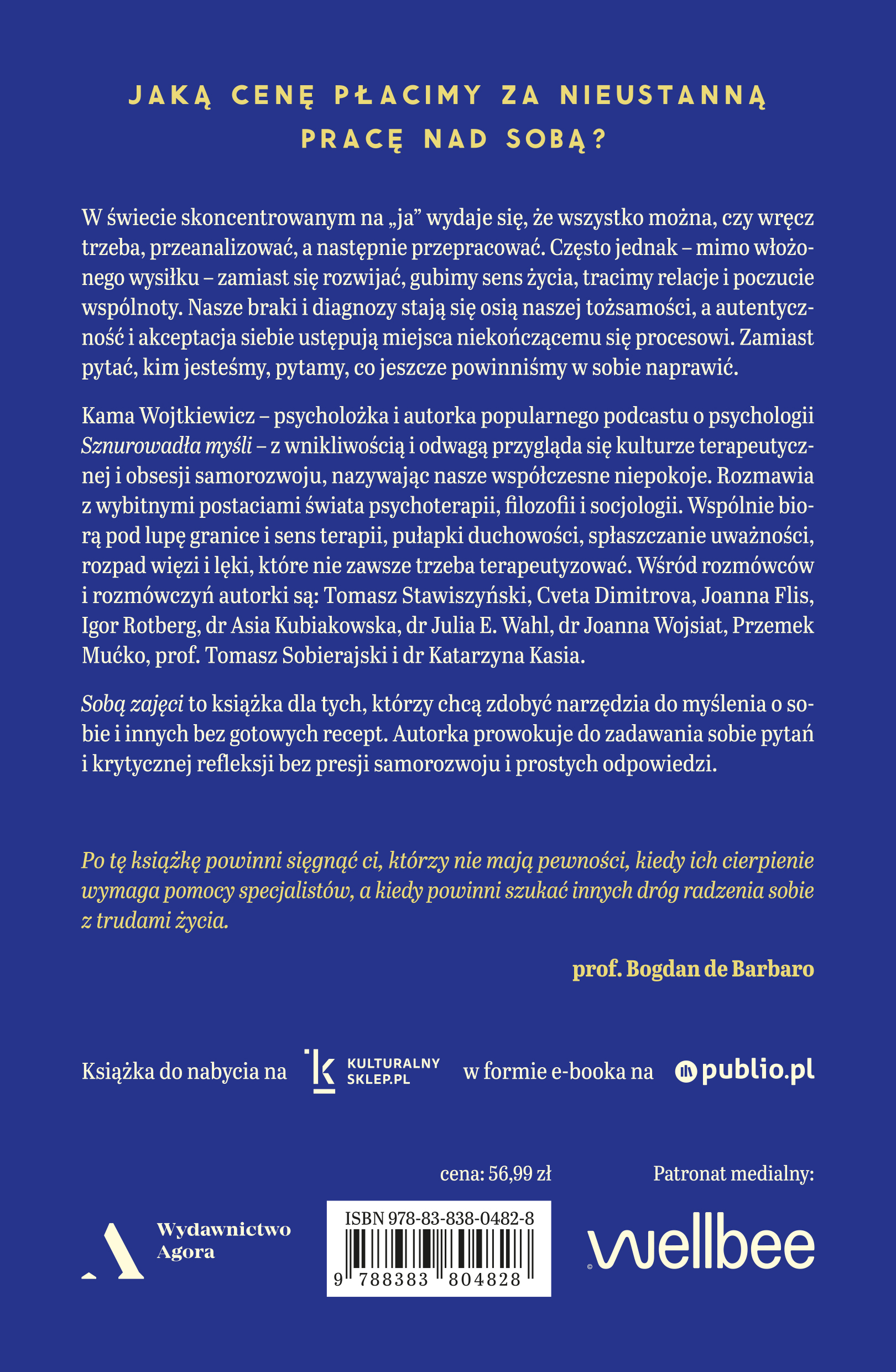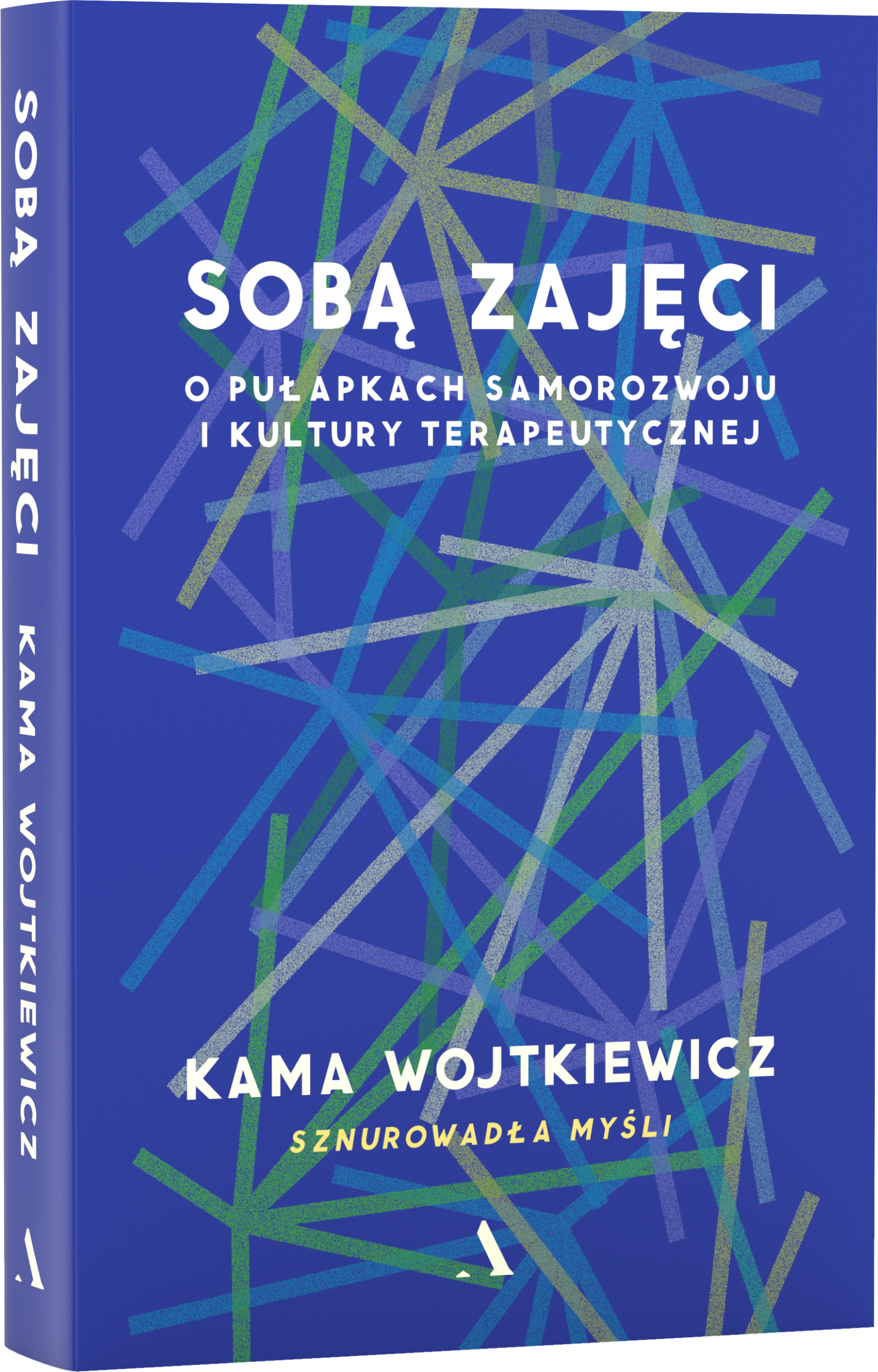 „Sobą zajęci” to świetna i przenikliwa opowieść o pułapkach samorozwoju, pop-psychologii i obsesji nieustającej pracy nad sobą. Kama Wojtkiewicz pyta, gdzie terapia pomaga, a gdzie zaczyna oddzielać nas od życia i relacji z innymi ludźmi. Kultura terapii stała się naszą codziennością, warto jest się jej przyjrzeć nieco bardziej krytycznie.”