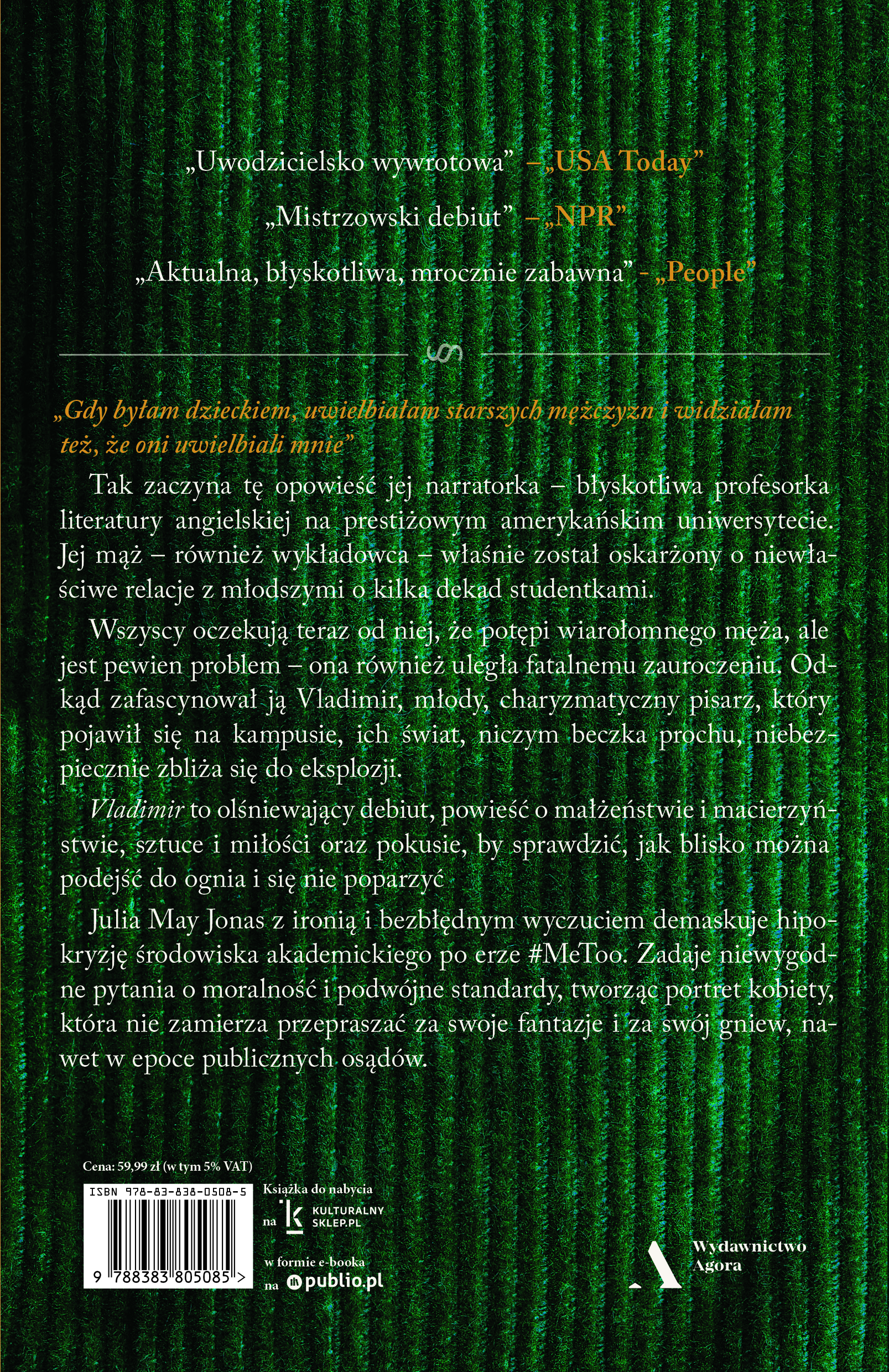 „Vladimir” to olśniewający debiut, powieść o małżeństwie i macierzyństwie, sztuce i miłości oraz pokusie, by sprawdzić, jak blisko można podejść do ognia i się nie poparzyć